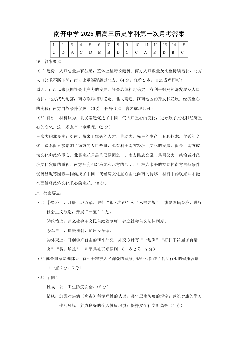 天津市南开中学2024-2025学年高三上学期10月月考英语试题历史答案