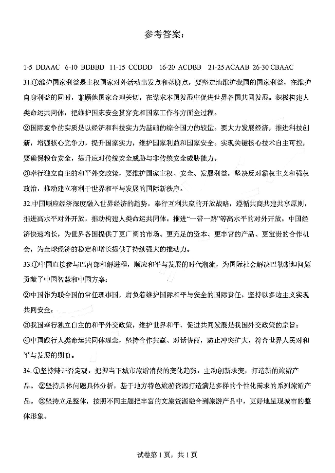 天津市南开中学2024-2025学年高三上学期10月月考政治答案