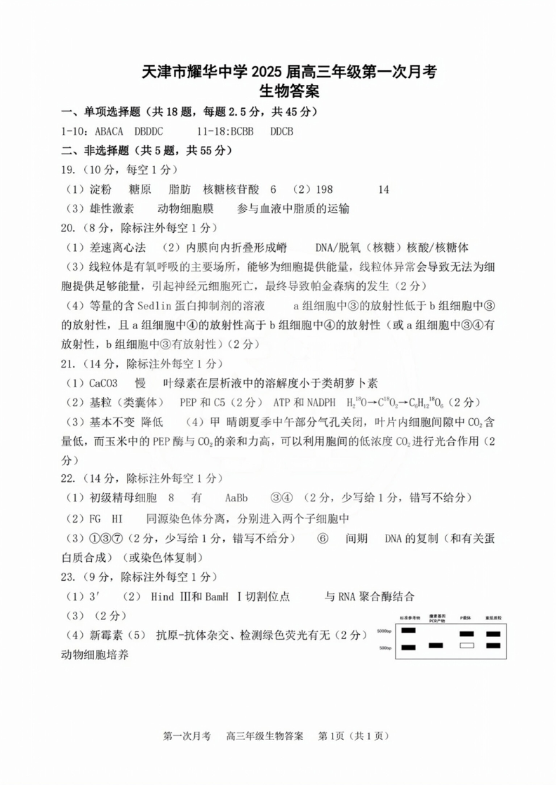 天津耀华中学2025届高三上期第一次月考生物答案