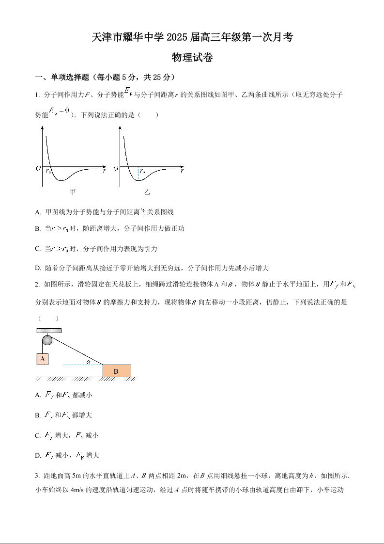 天津耀华中学2025届高三上期第一次月考物理