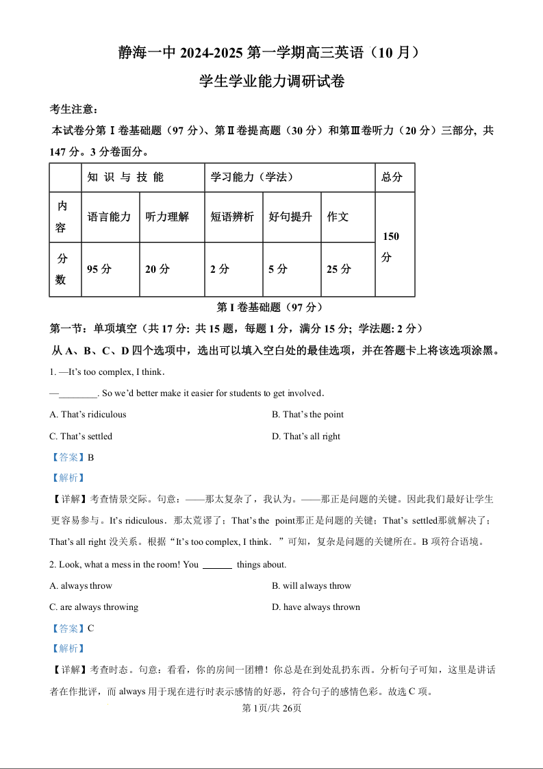天津市静海区第一中学2024-2025第一学期高三学生学业能力调研试卷英语试题(解析版)