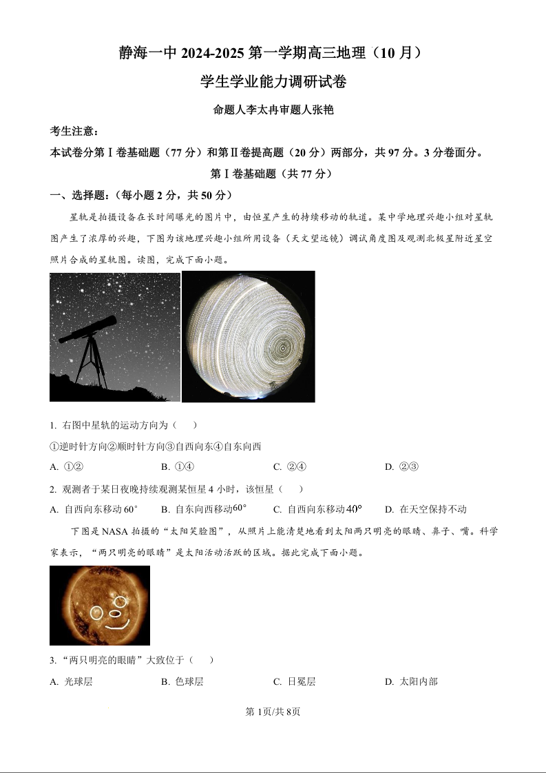 天津市静海区第一中学2024-2025第一学期高三学生学业能力调研试卷地理试题(原卷版)