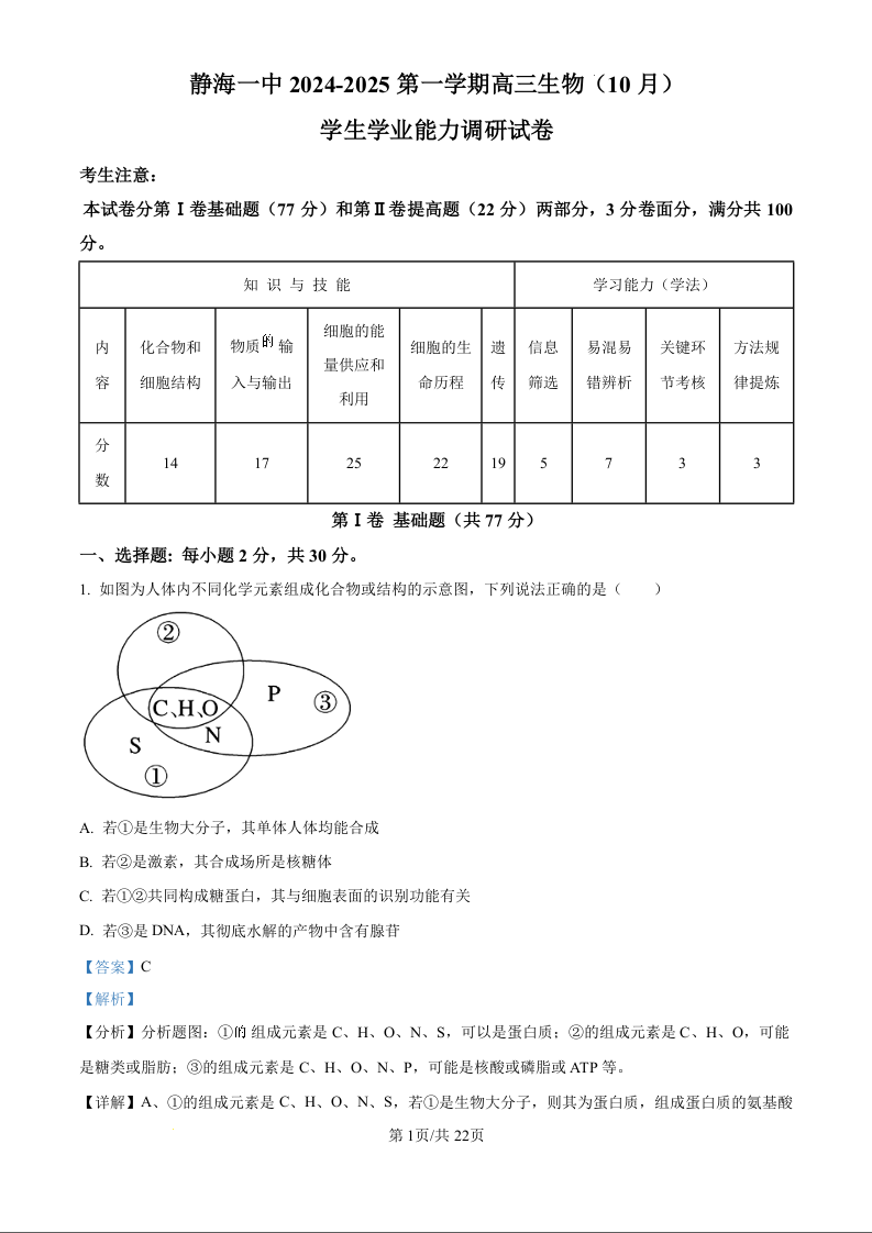 天津市静海区第一中学2024-2025第一学期高三学生学业能力调研试卷生物试题(解析版)