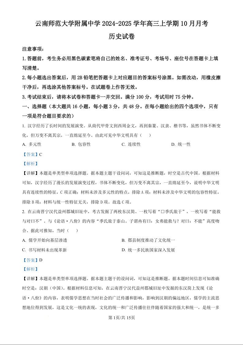 云南师范大学附属中学2025届高三高考适应性月考卷(四)历史答案