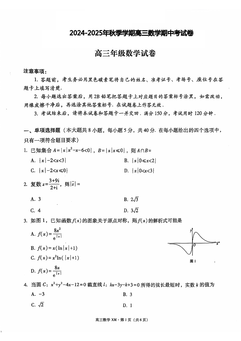 云南省大理白族自治州宾川县高平第一完全中学2025届高三上学期期中考试数学