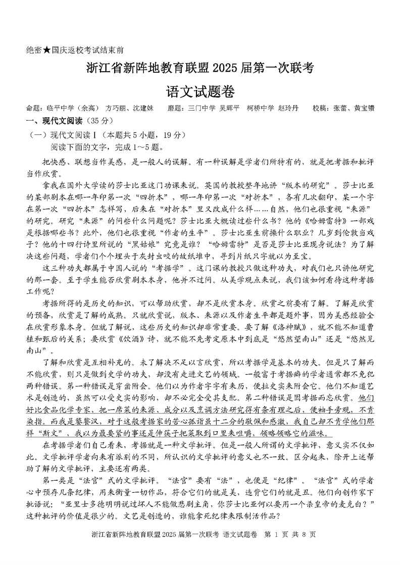 浙江卷浙江省新阵地教育联盟 2025 届第一次联考语文
