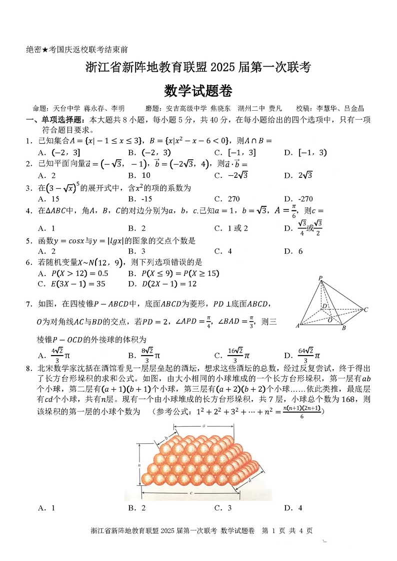 浙江卷浙江省新阵地教育联盟 2025 届第一次联考数学