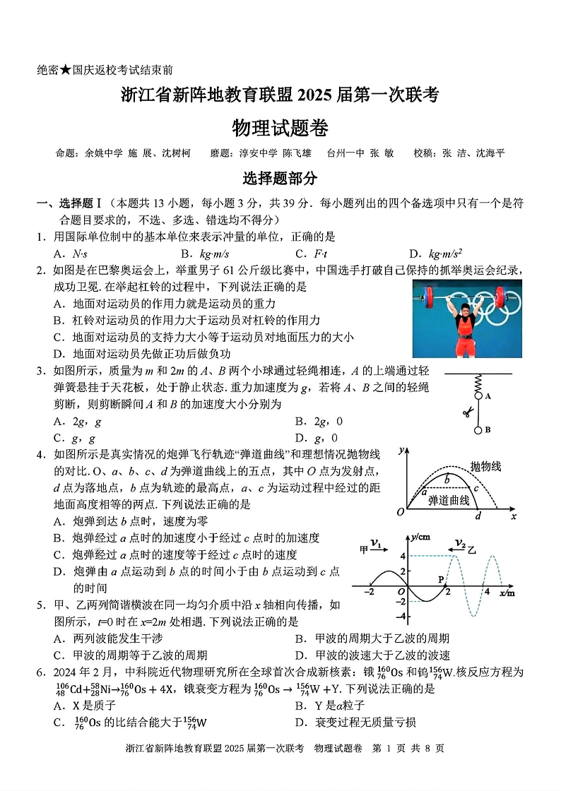 浙江卷浙江省新阵地教育联盟 2025 届第一次联考物理
