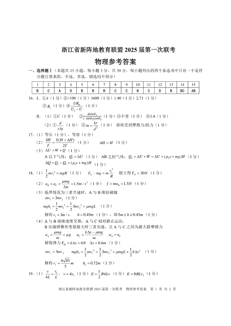 浙江卷浙江省新阵地教育联盟 2025 届第一次联考物理答案