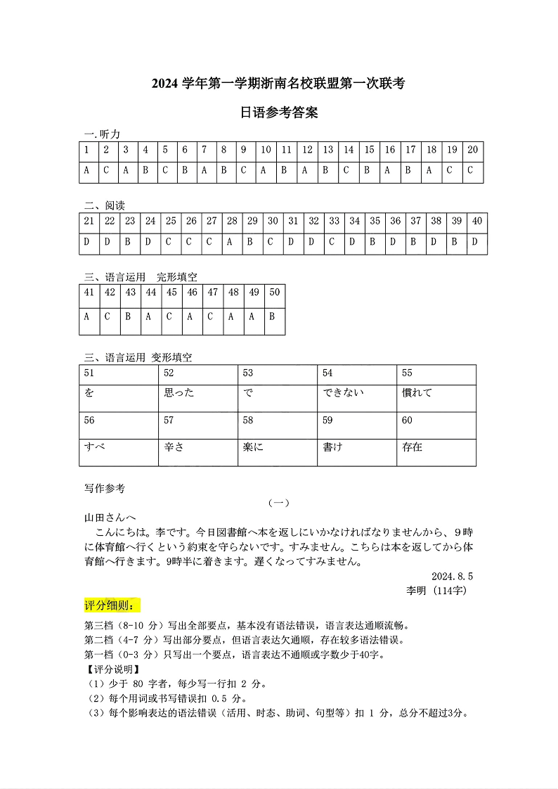浙江省2024学年第一学期浙南名校联盟第一次联考日语答案