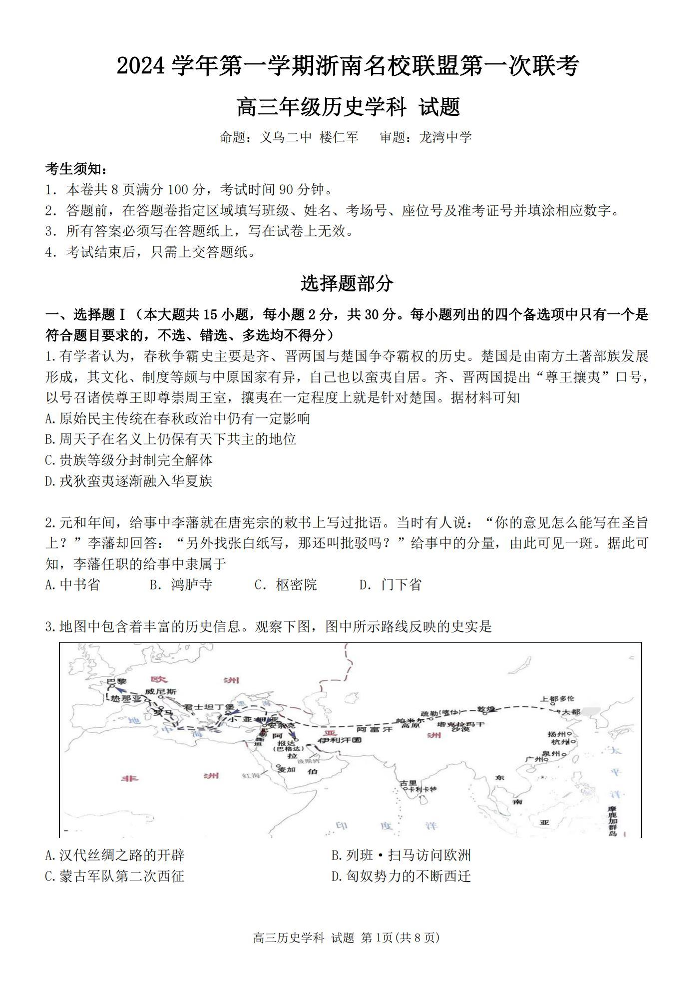 浙江省2024学年第一学期浙南名校联盟第一次联考历史