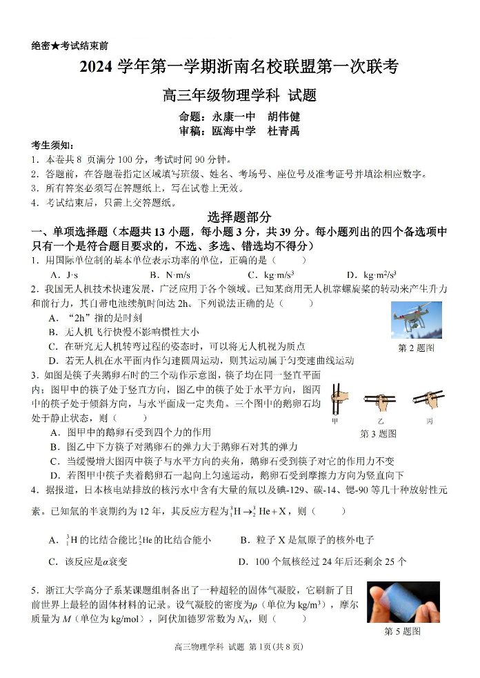 浙江省2024学年第一学期浙南名校联盟第一次联考物理