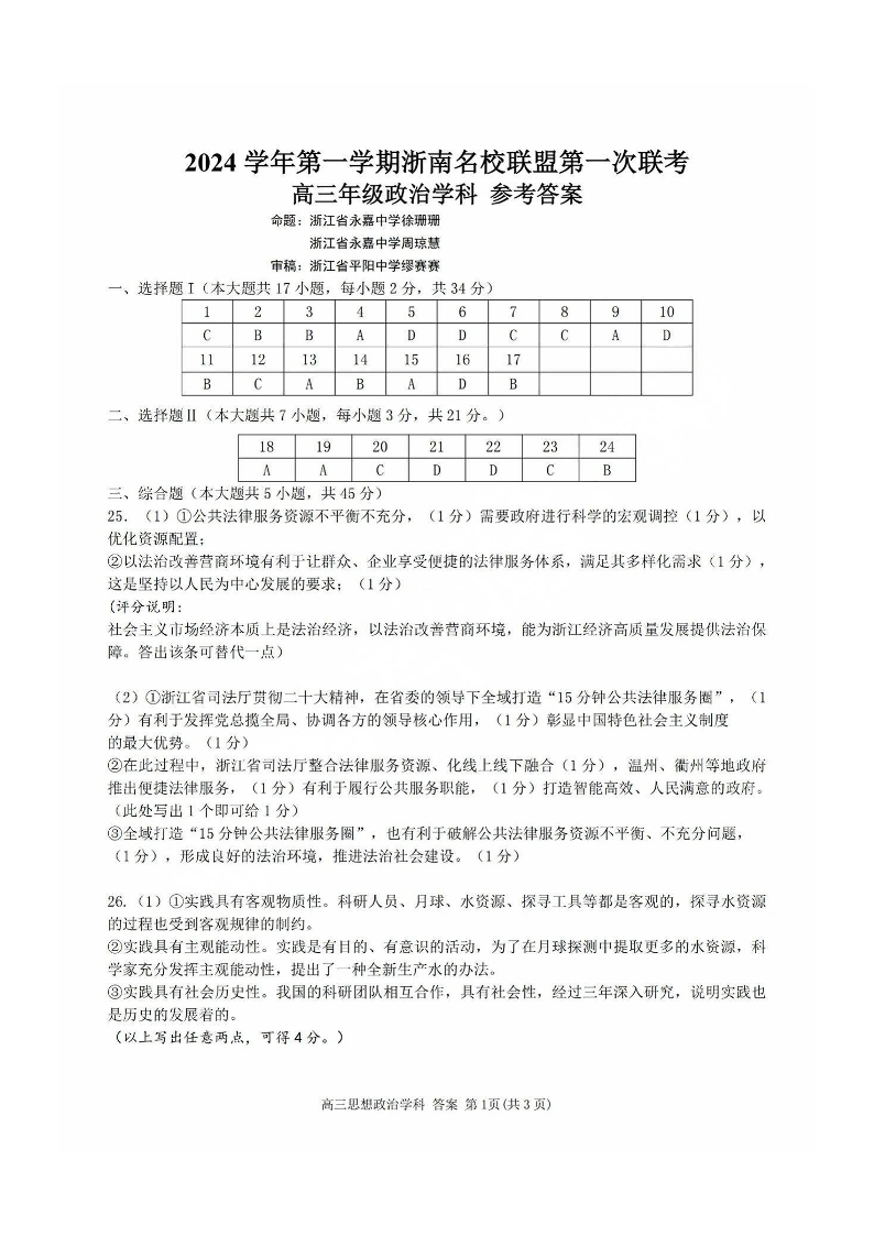 浙江省2024学年第一学期浙南名校联盟第一次联考政治答案
