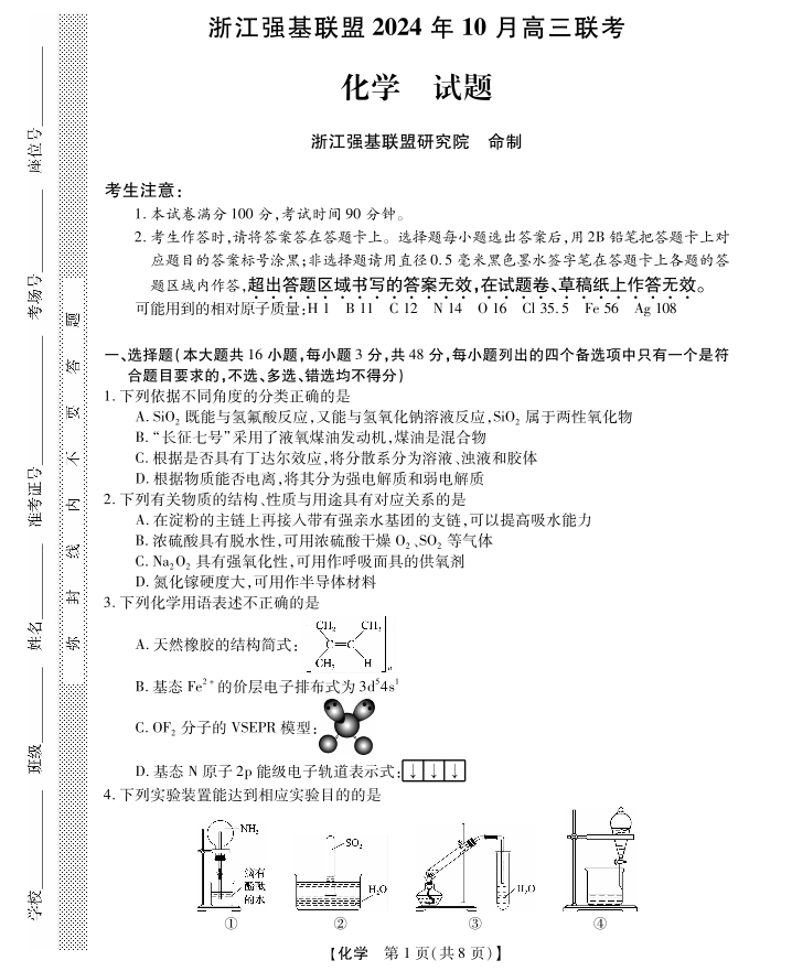 浙江省强基联盟2024年10月高三联考化学