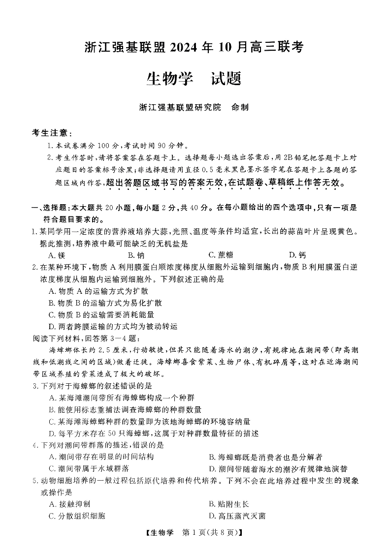 浙江省强基联盟2024年10月高三联考生物