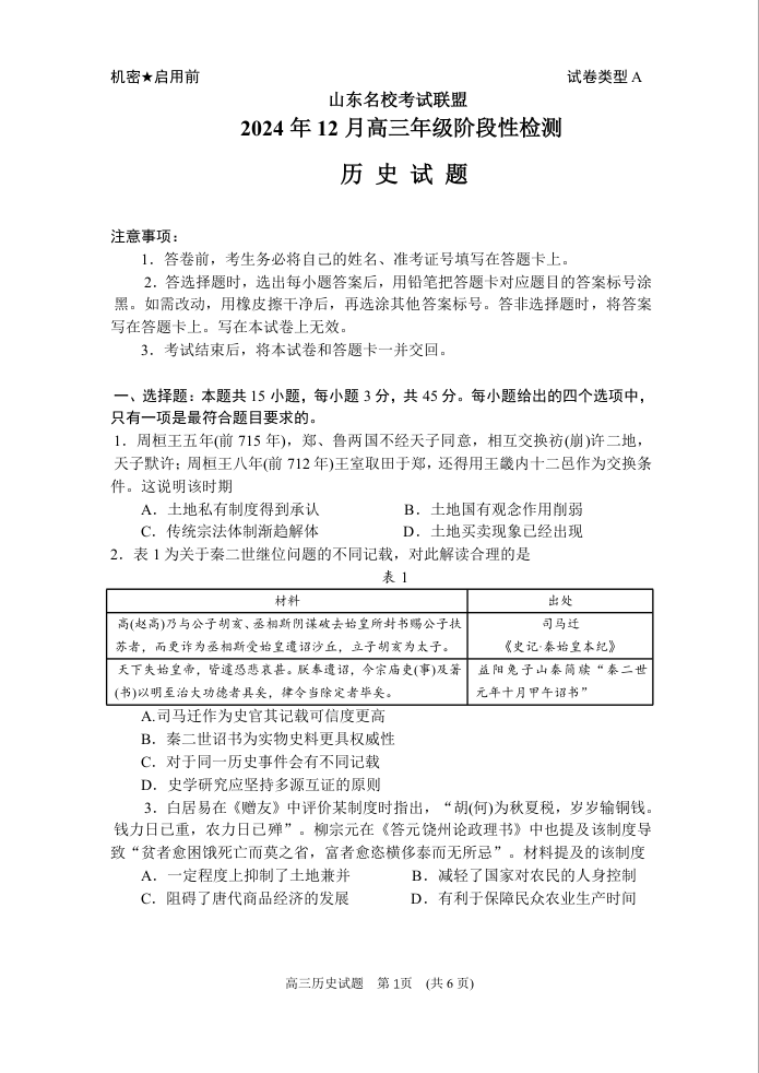 山东省济南市名校考试联盟2024.12高三年级阶段性检测历史