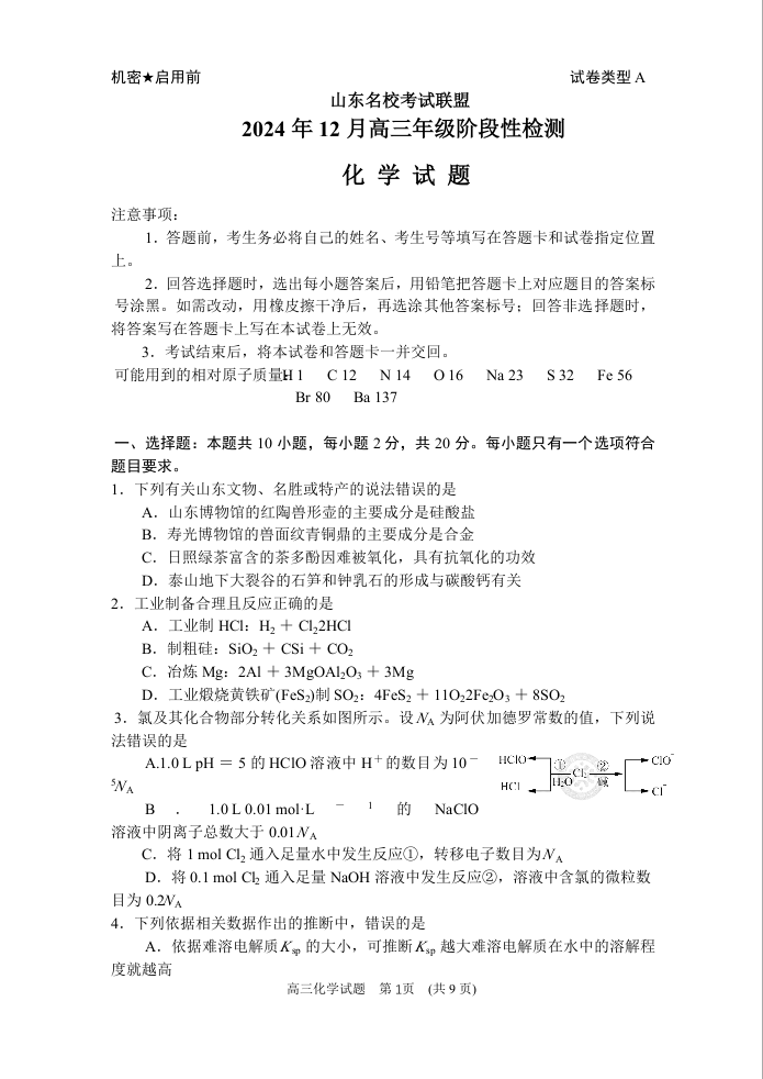山东省济南名校考试联盟2024.12高三年级阶段性测试化学