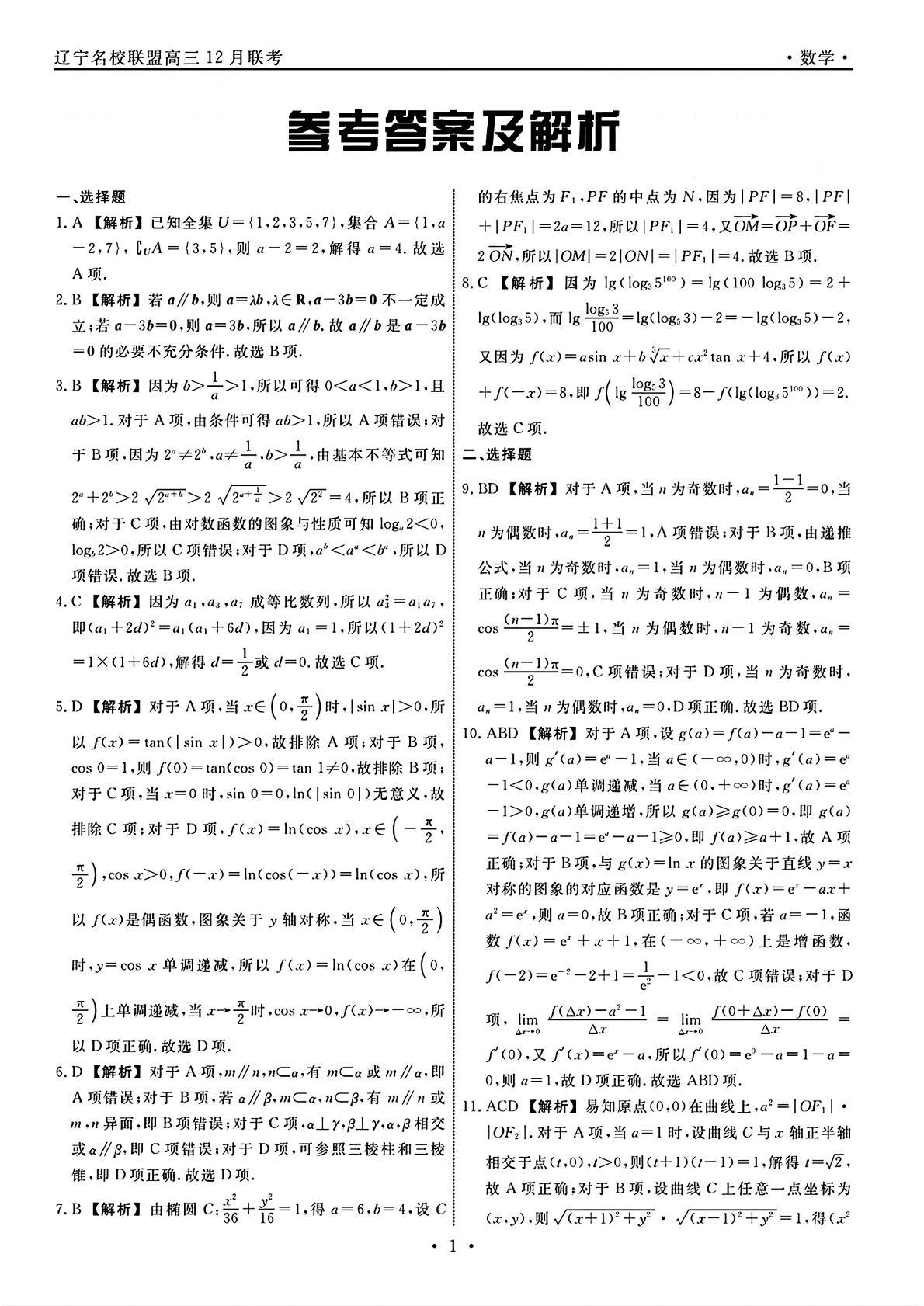 辽宁省名校联盟2024年高三12月份联合考试数学答案