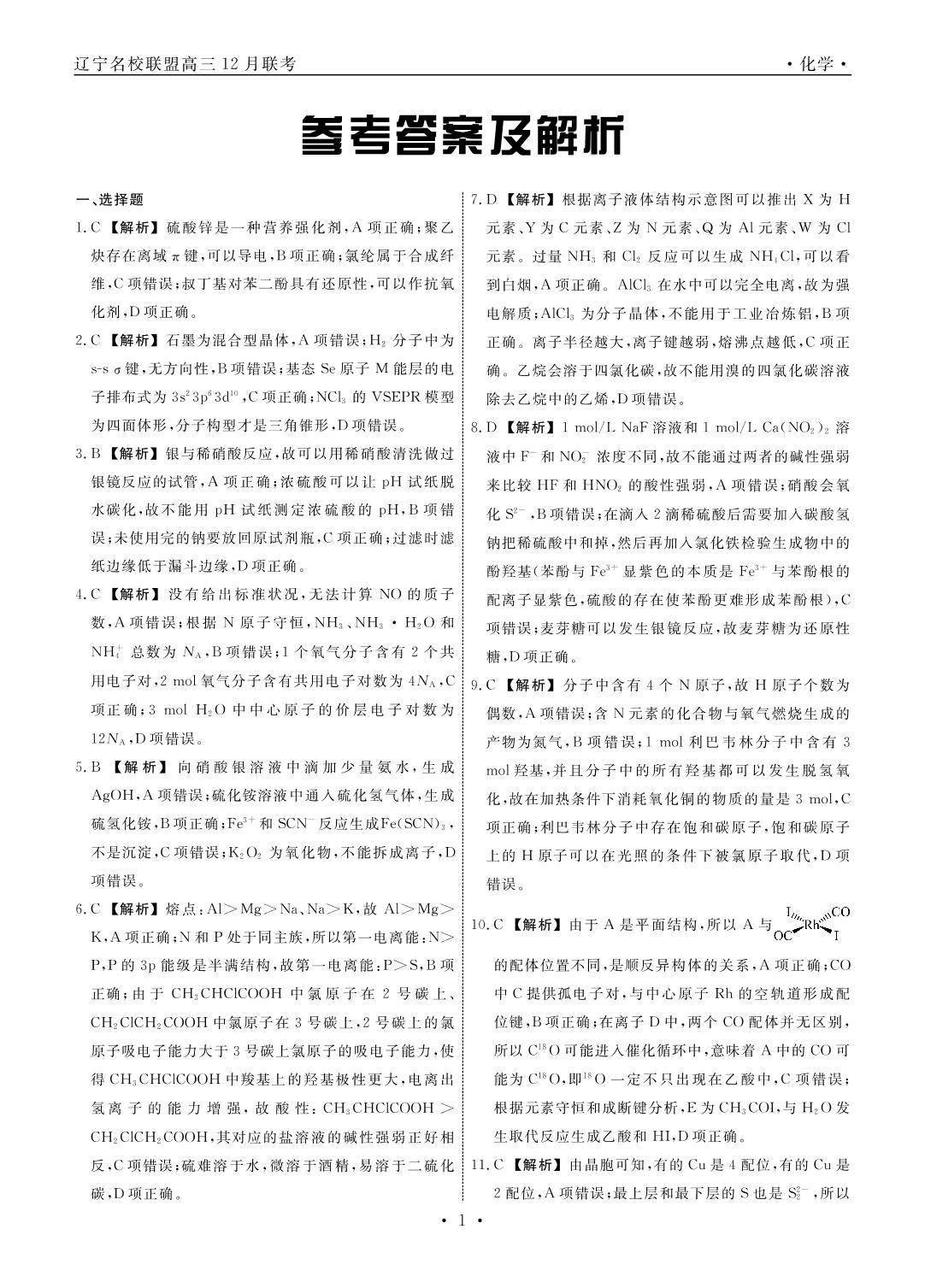 辽宁省名校联盟2024年高三12月份联合考试化学答案