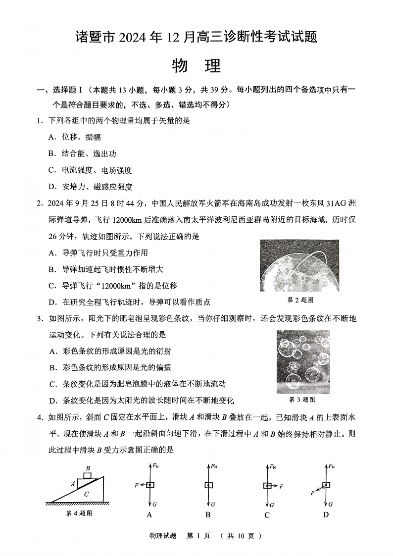 浙江省绍兴市诸暨市2025届高三上学期12月诊断性考试(一模)物理PDF版含答案