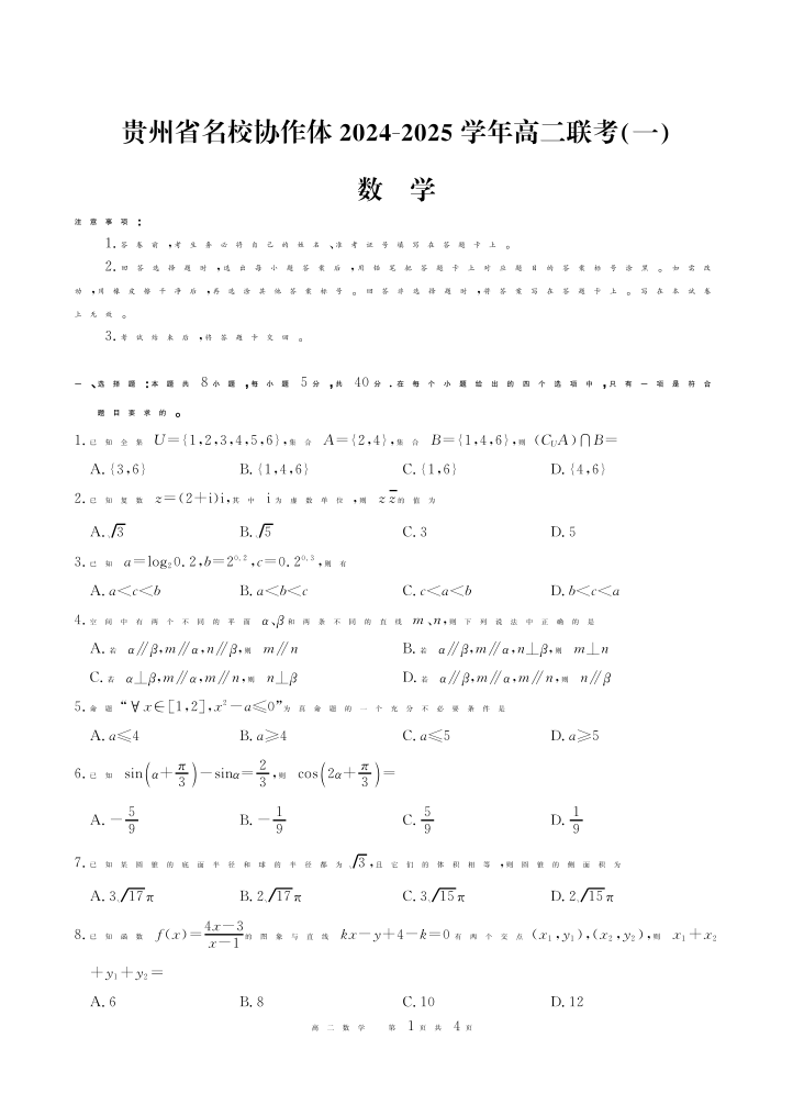 贵州省名校协作体2024-2025学年高二上学期12月联考(一)数学