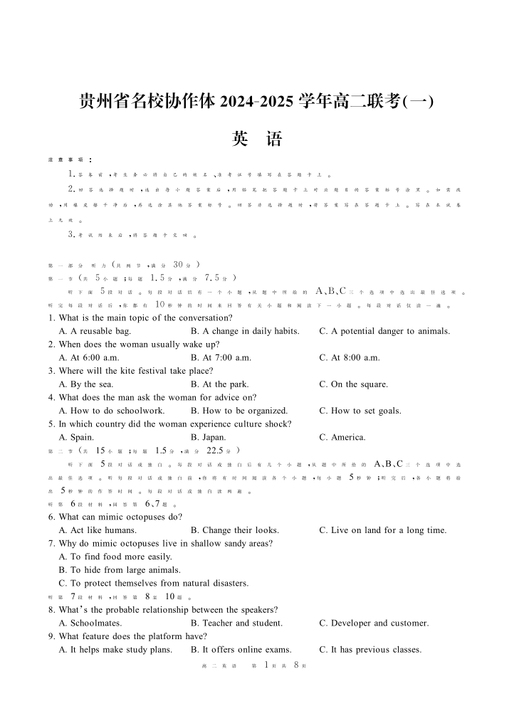 贵州省名校协作体2024-2025学年高二上学期12月联考(一)英语