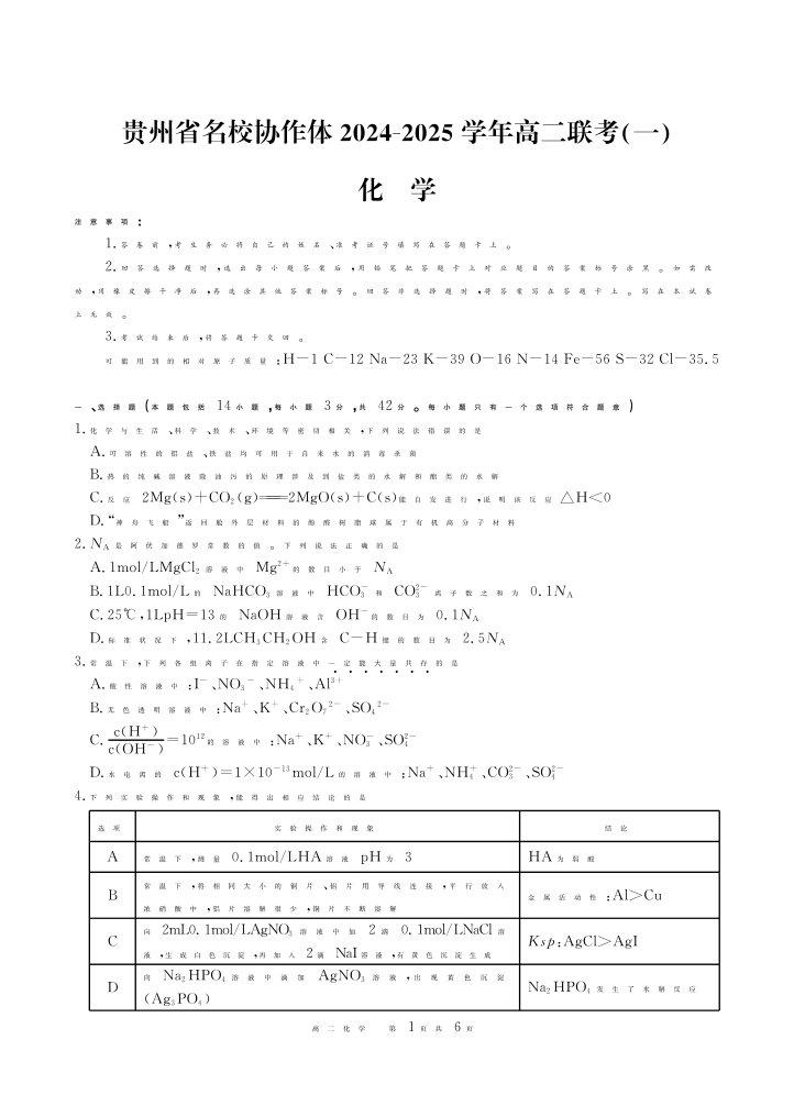 贵州省名校协作体2024-2025学年高二上学期12月联考(一)化学