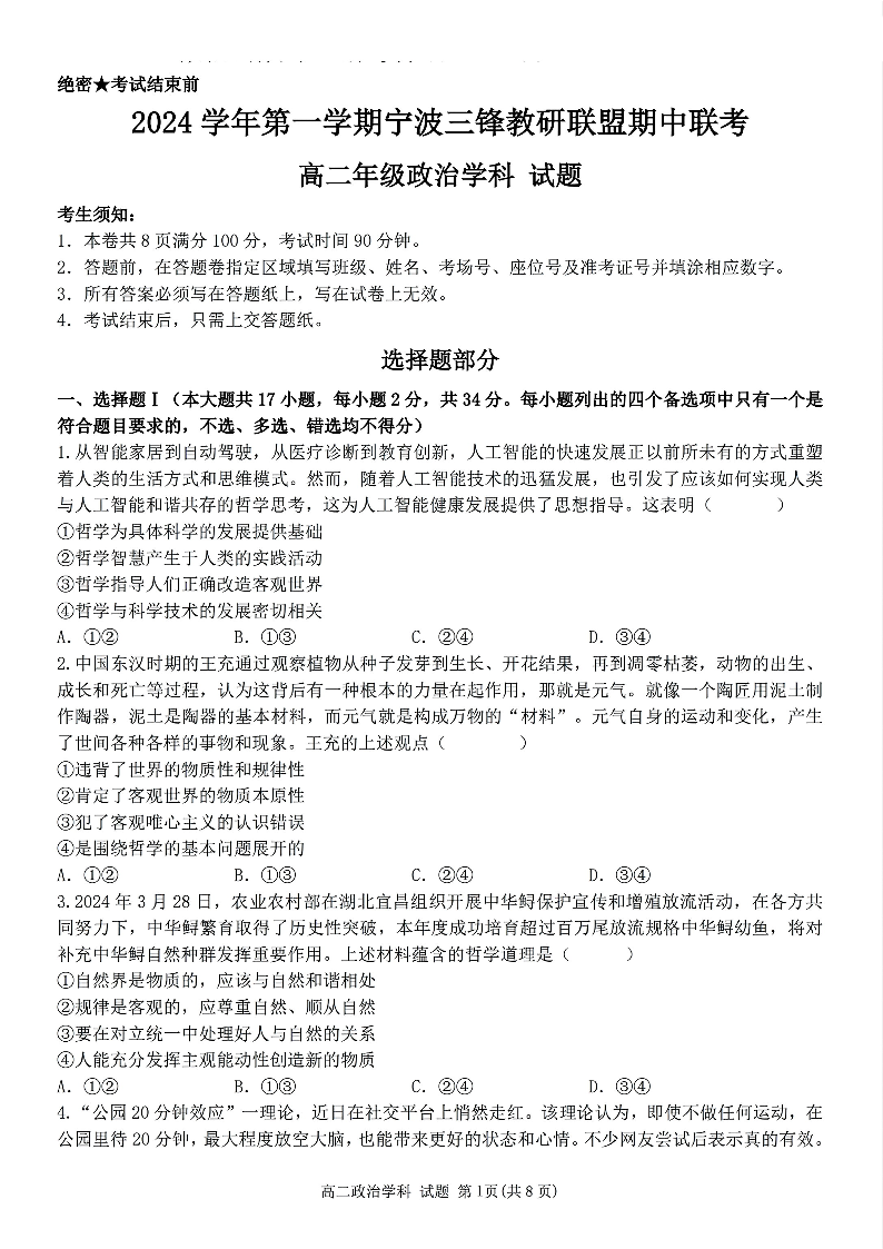 浙江省宁波市三锋教研联盟2024-2025学年高二上学期期中考试政治PDF版含答案