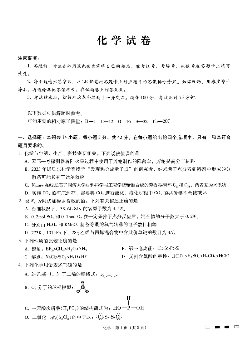 重庆市巴蜀中学2025届高考适应性月考卷(二)化学
