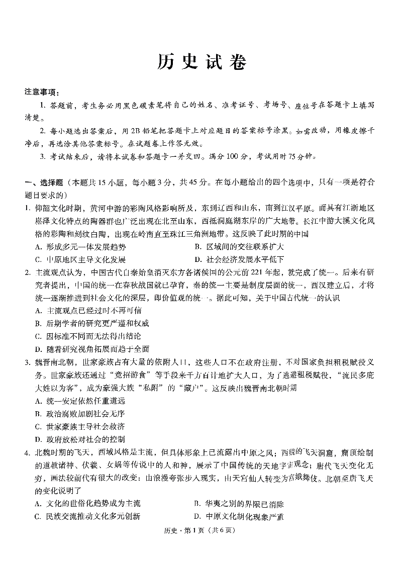 重庆市巴蜀中学2025届高考适应性月考卷(二)历史