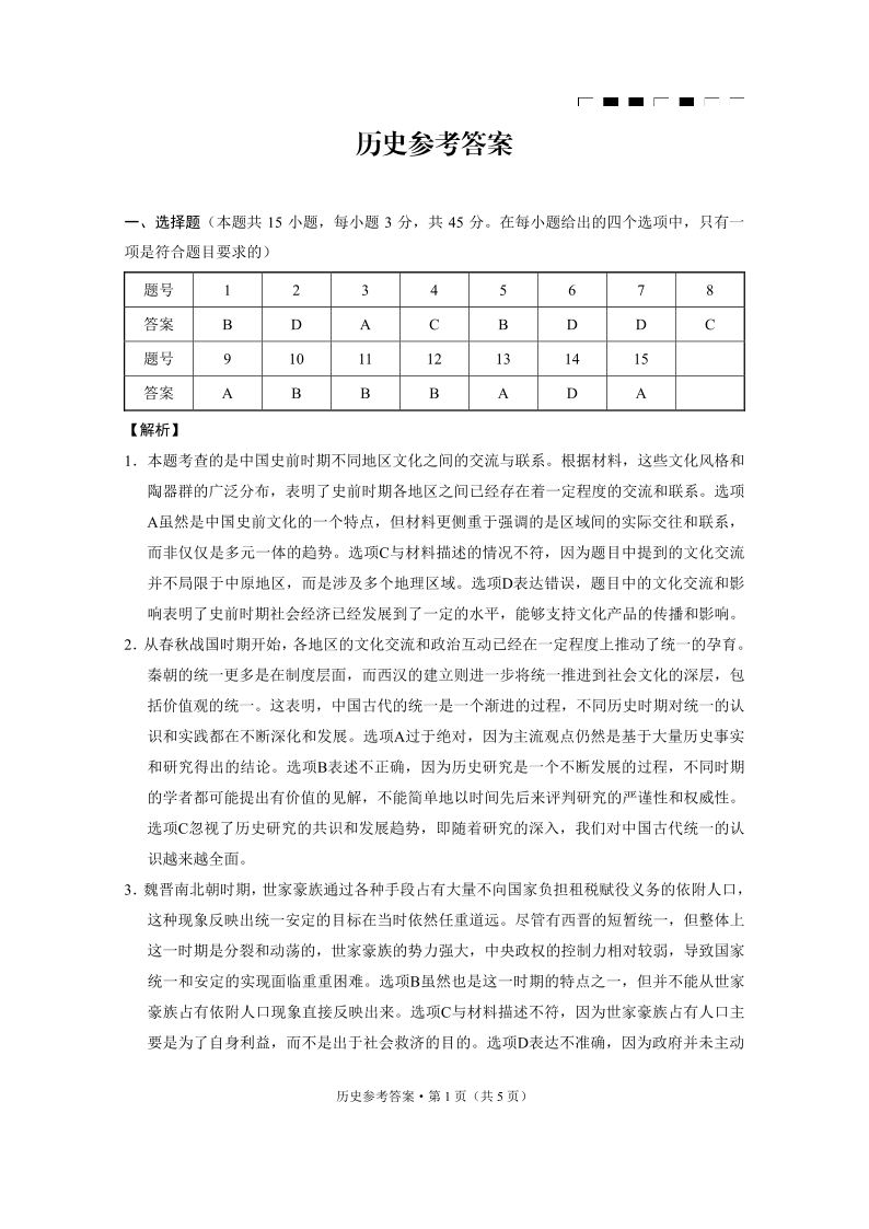重庆市巴蜀中学2025届高考适应性月考卷(二)历史答案