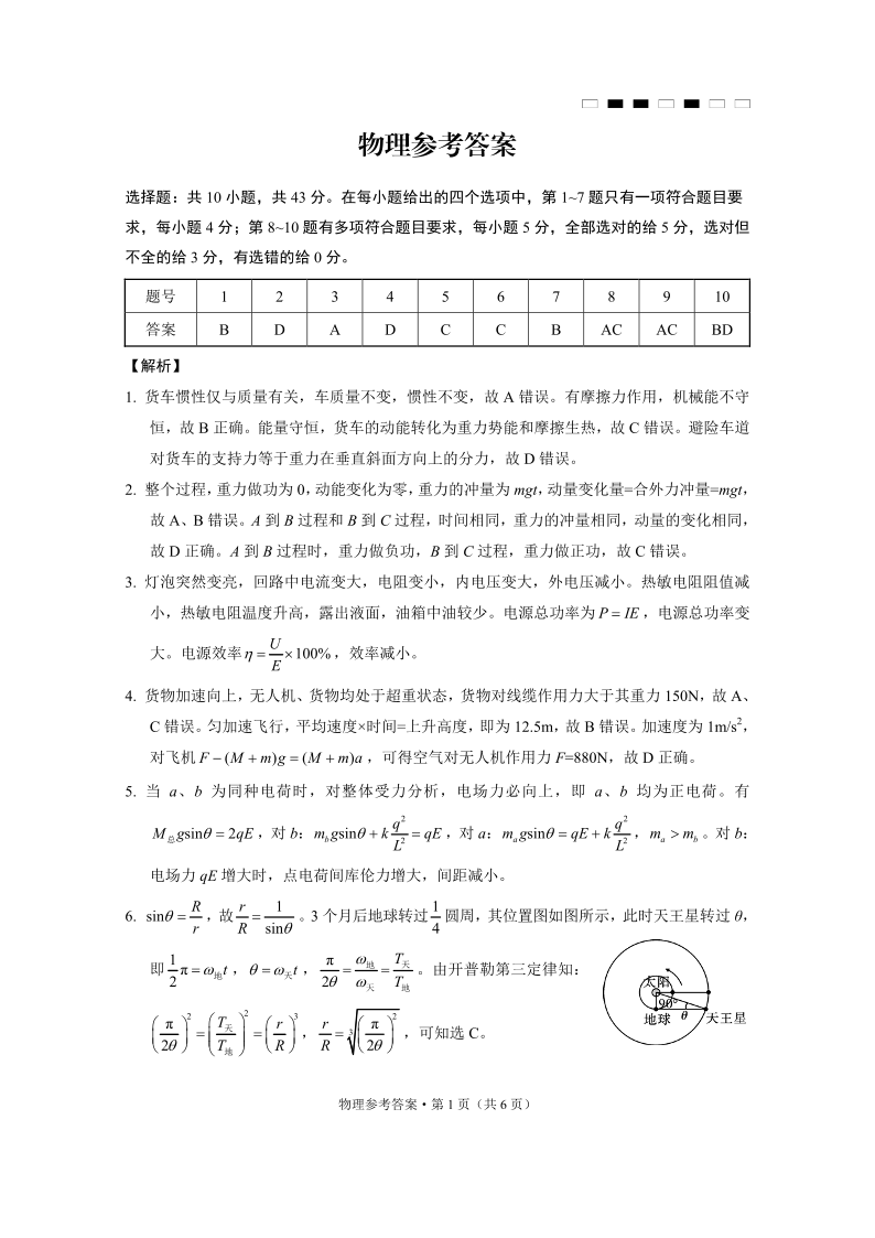 重庆市巴蜀中学2025届高考适应性月考卷(二)物理答案