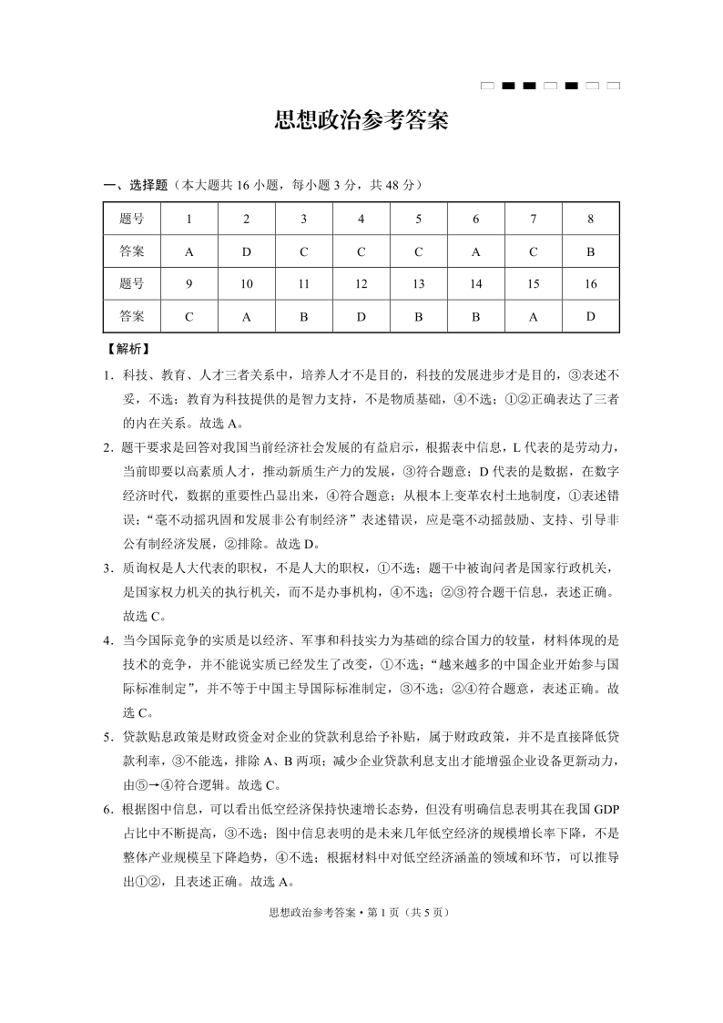 重庆市巴蜀中学2025届高考适应性月考卷(二)思想政治答案