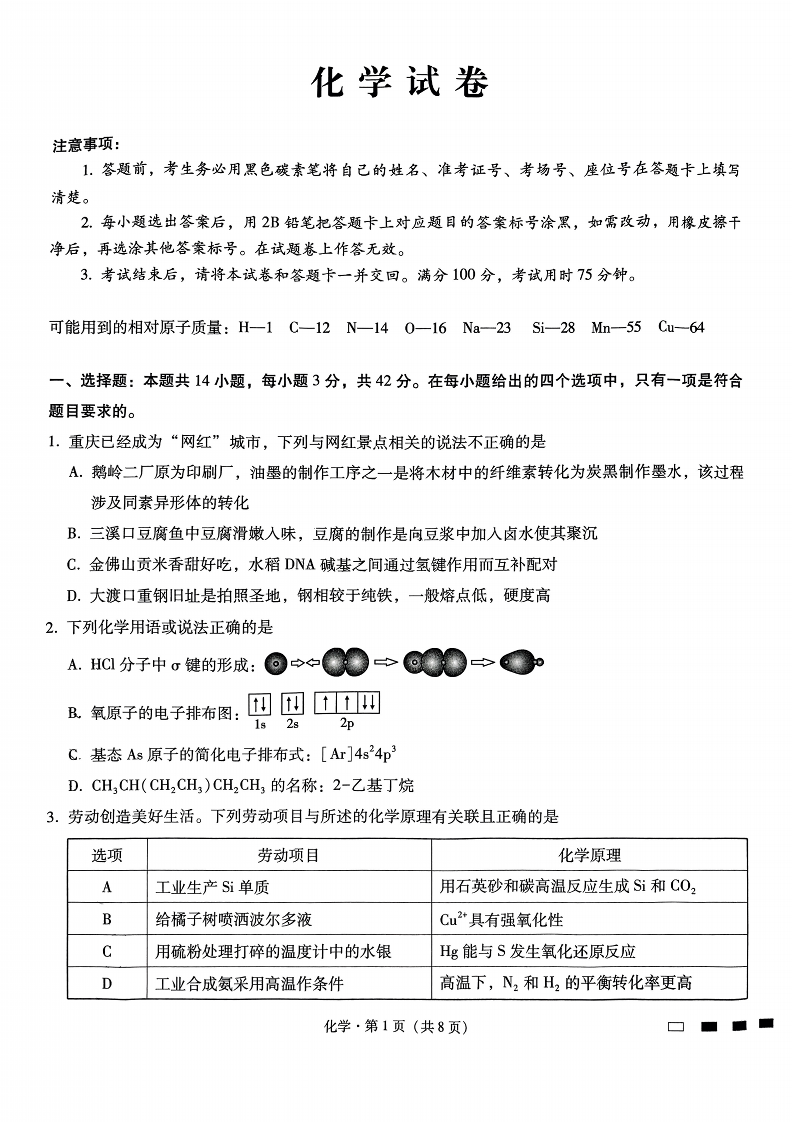 重庆市第八中学2025届高考适应性月考卷(二)化学