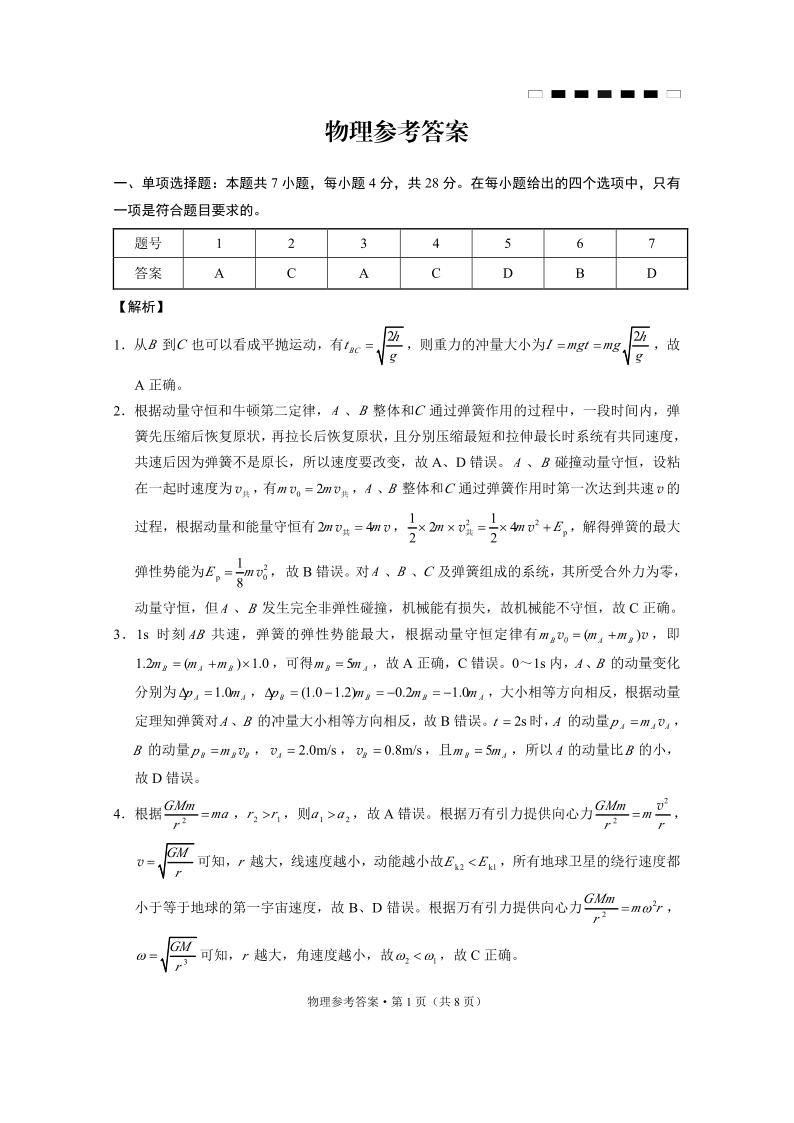重庆市第八中学2025届高考适应性月考卷(二)物理答案
