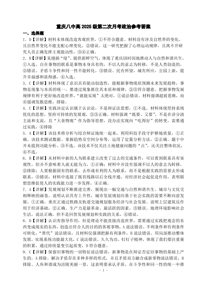 重庆市第八中学2025届高考适应性月考卷(二)政治答案