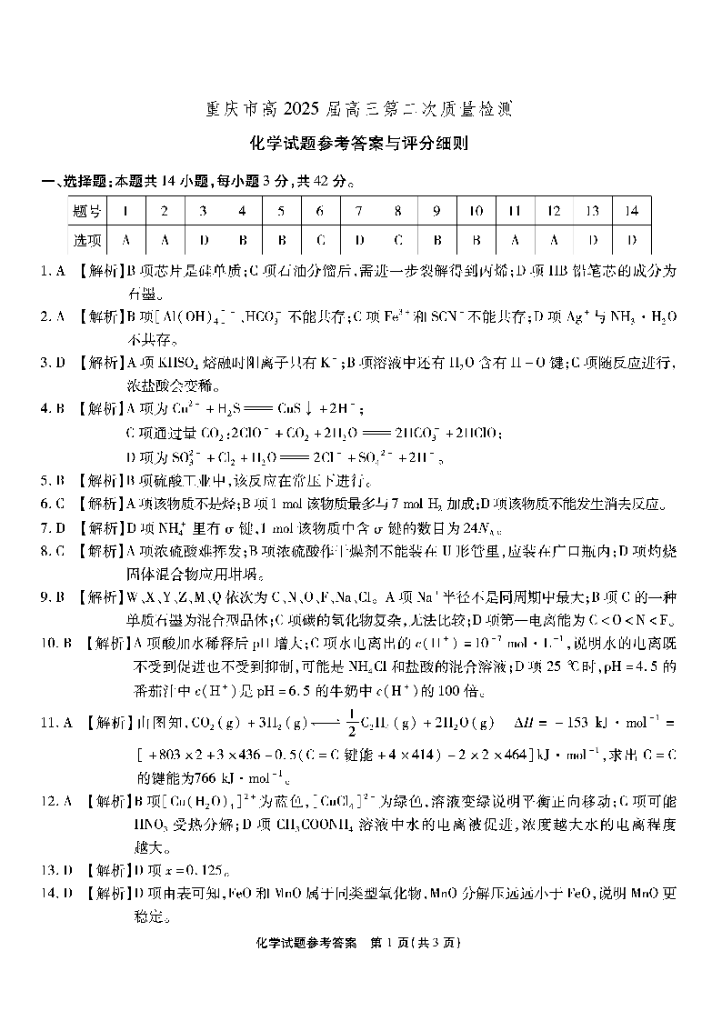 重庆市南开中学2025届高三第二次质量检测化学答案