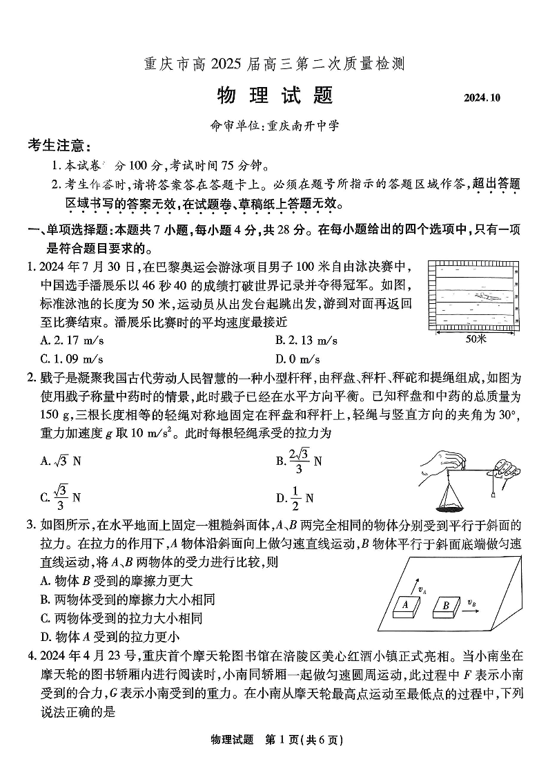 重庆市南开中学2025届高三第二次质量检测物理