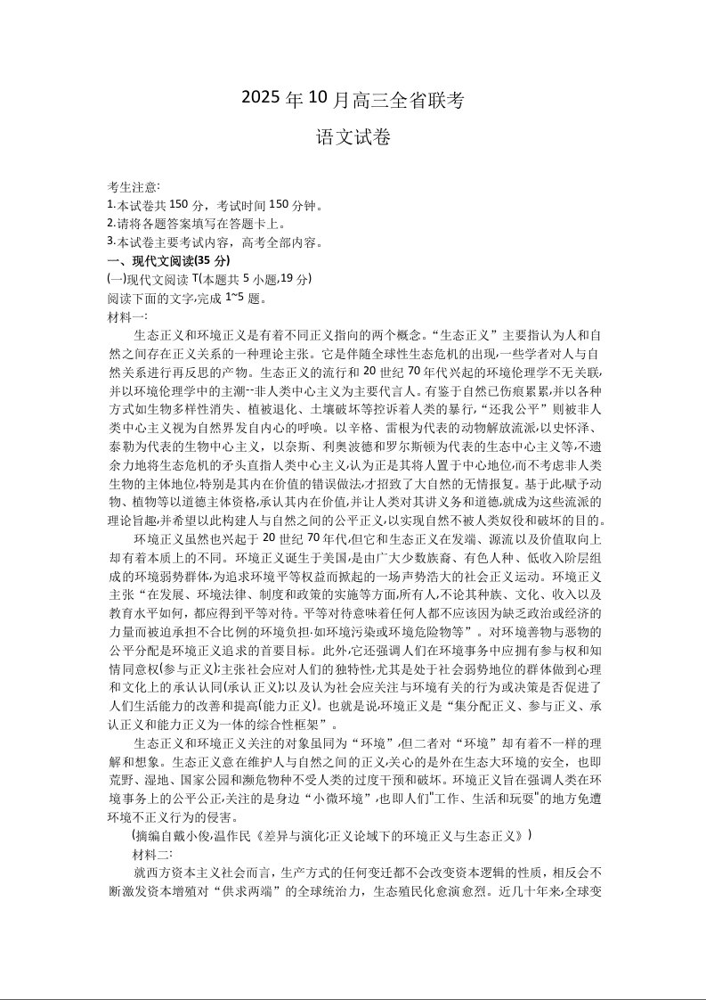 江西省部分高中学校2024-2025学年度高三上学期联考语文试卷
