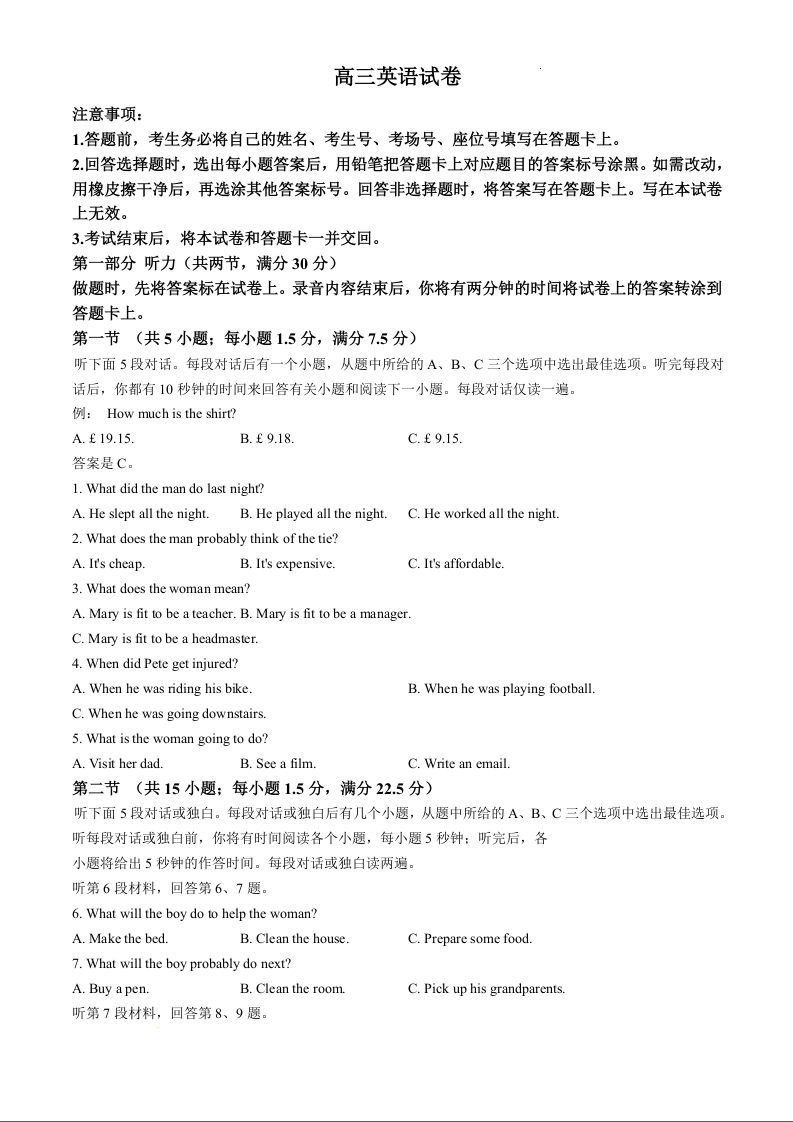 江西省部分高中学校2024-2025学年度高三上学期联考英语试卷