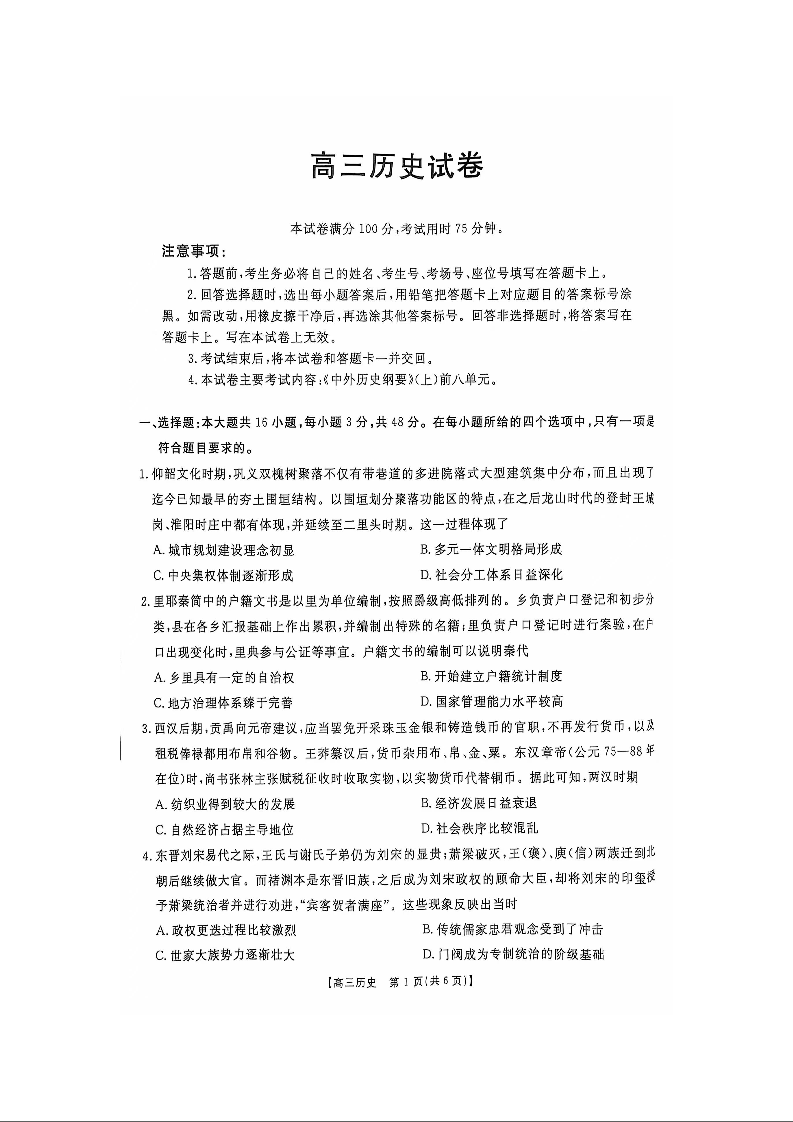 江西省部分高中学校2024-2025学年度高三上学期联考历史+答案