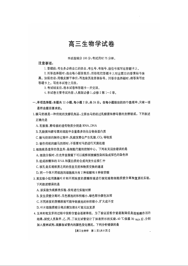 江西省部分高中学校2024-2025学年度高三上学期联考生物+答案