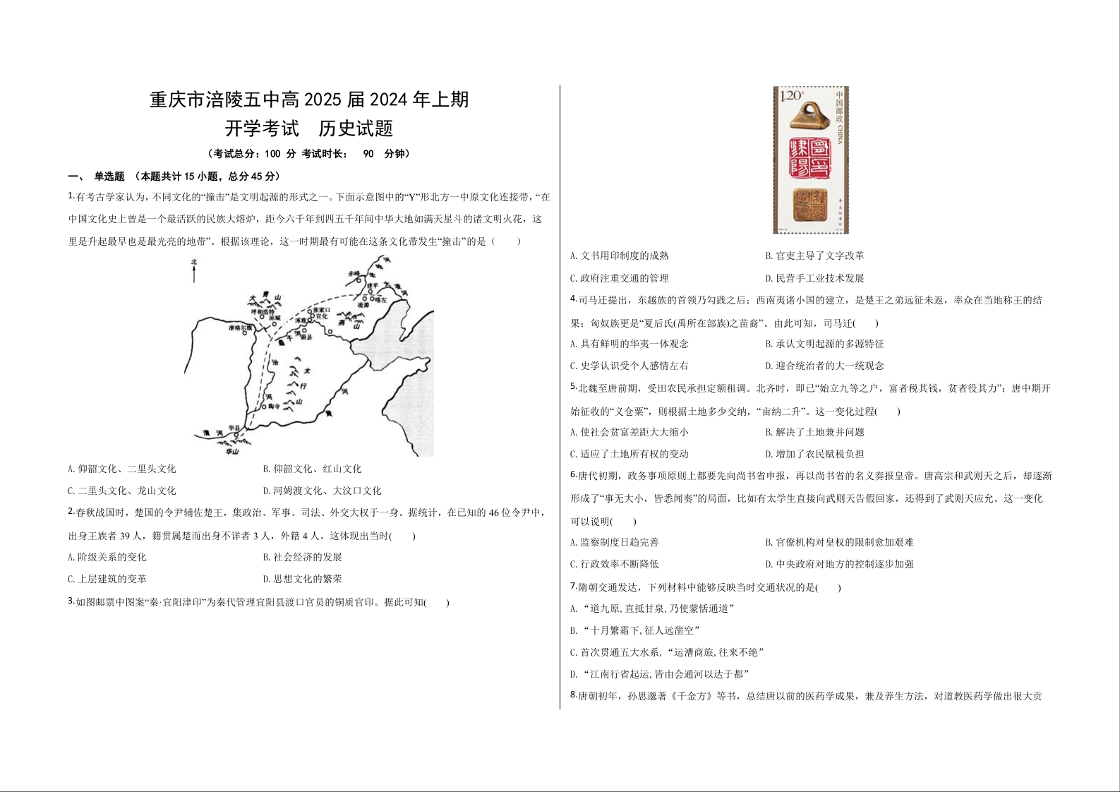 重庆市涪陵第五中学2025届高三上学期开学考试历史+答案