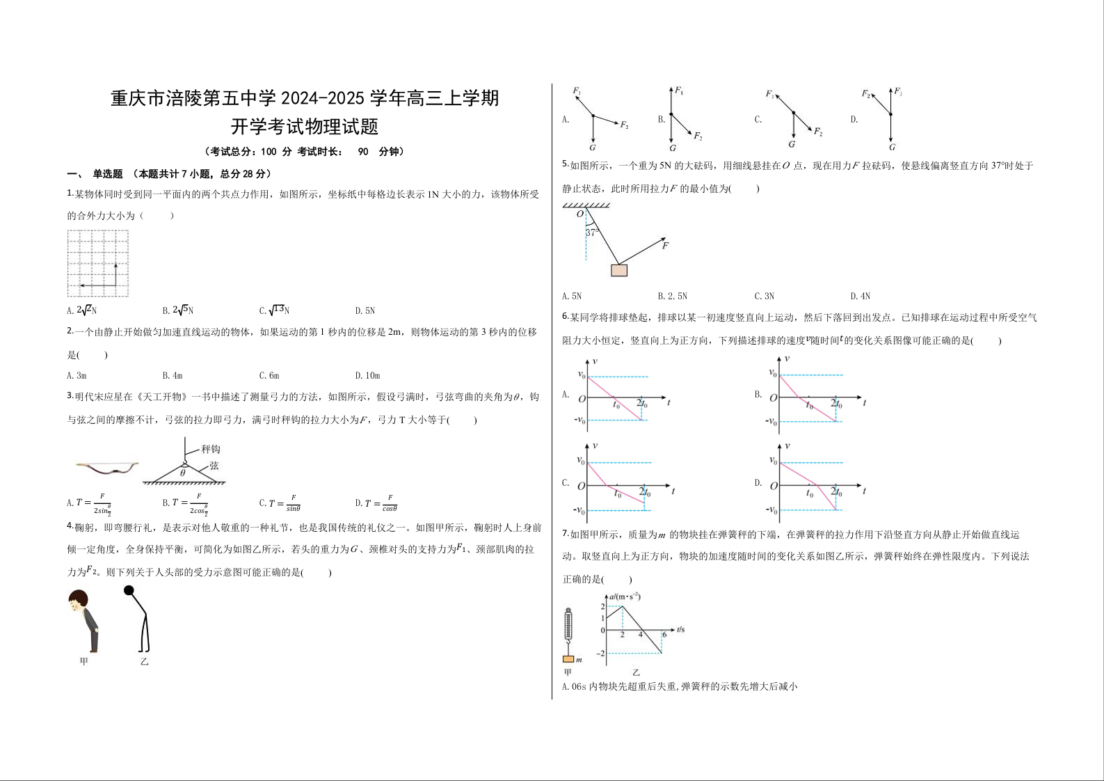 重庆市涪陵第五中学2025届高三上学期开学考试物理+答案