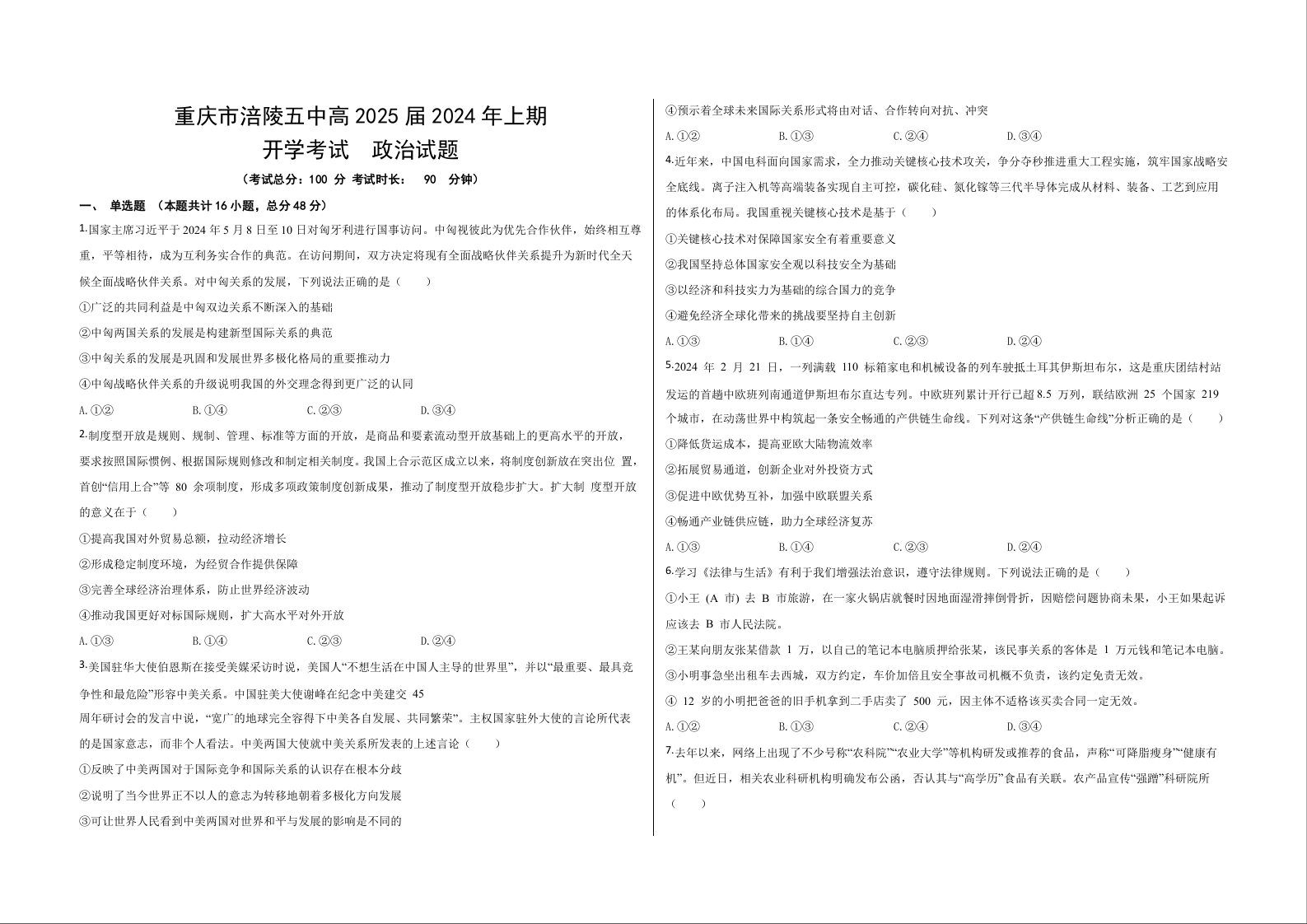 重庆市涪陵第五中学2025届高三上学期开学考试政治+答案