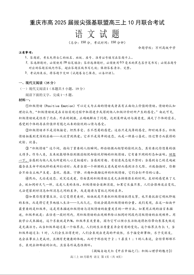 重庆市高2025届拔尖强基联盟高三上10月联合考试语文