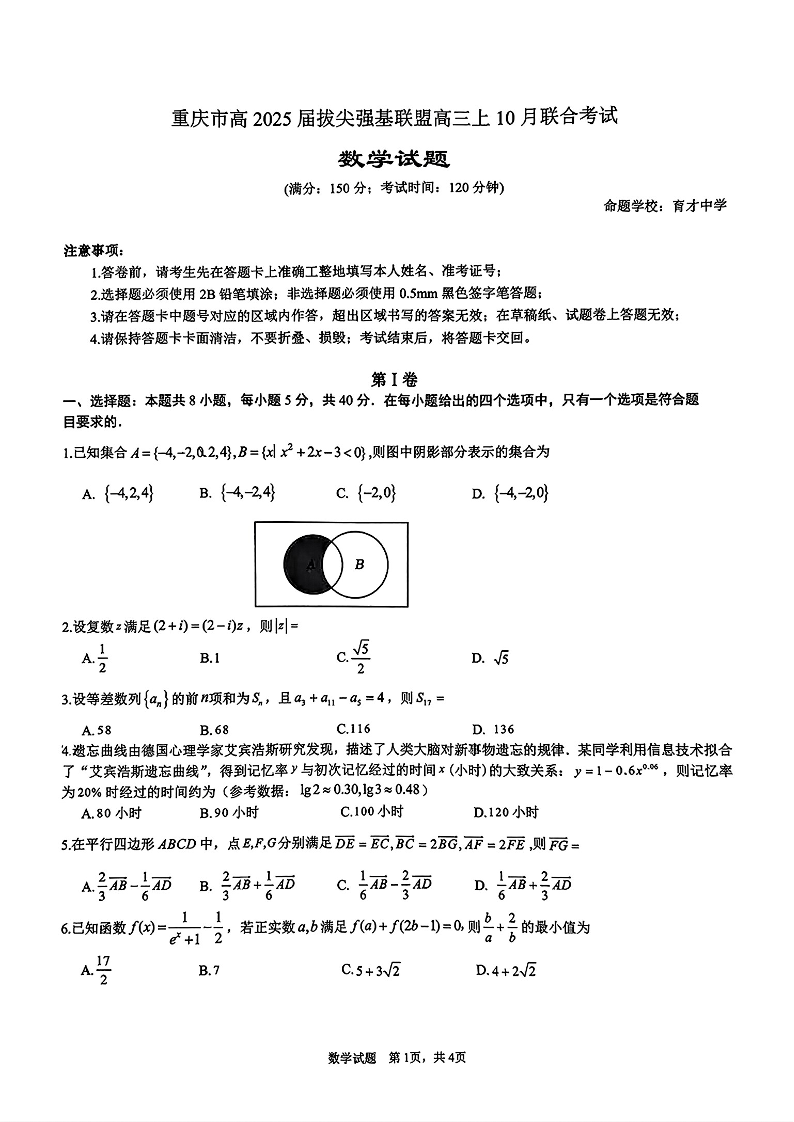 重庆市高2025届拔尖强基联盟高三上10月联合考试数学+答案