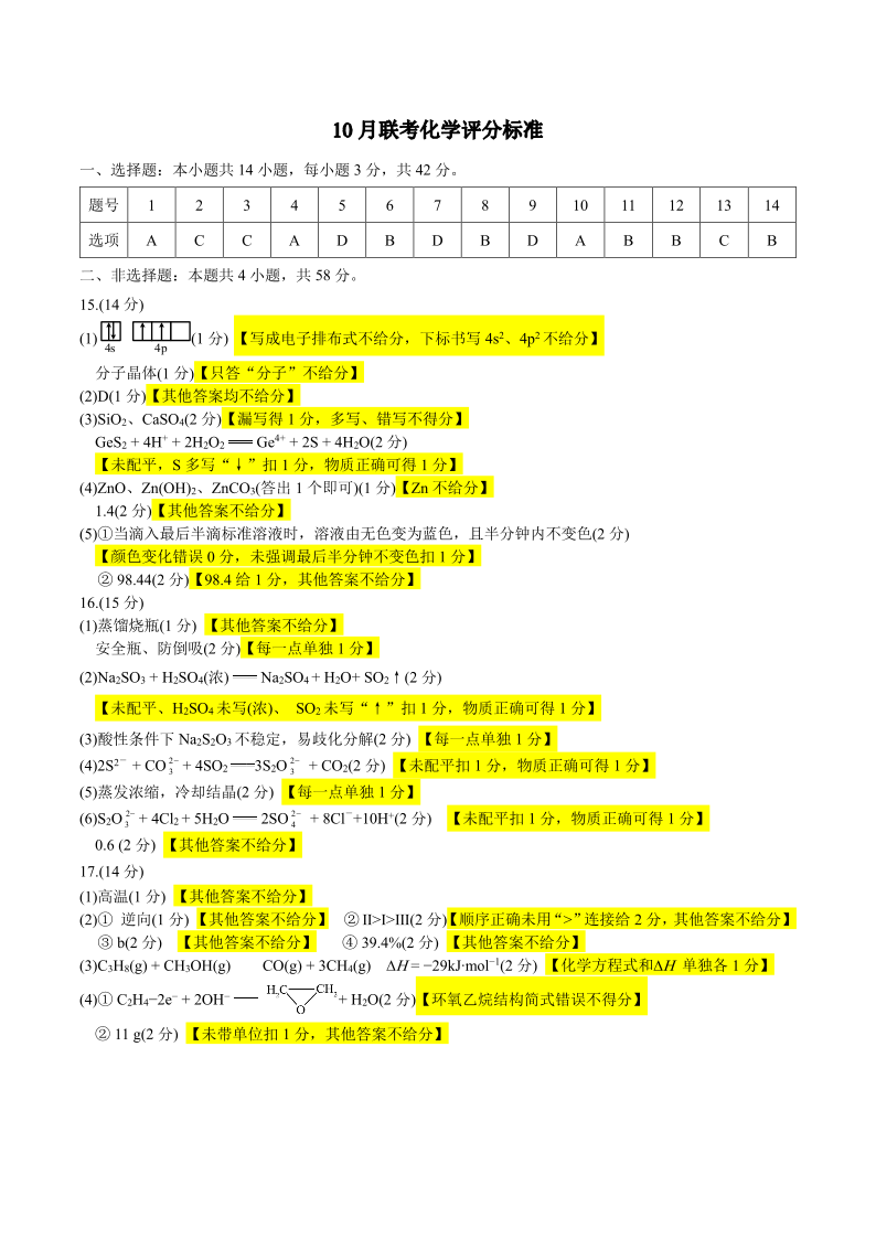 重庆市高2025届拔尖强基联盟高三上10月联合考试化学答案