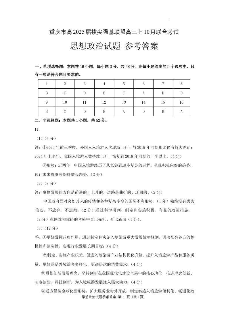 重庆市高2025届拔尖强基联盟高三上10月联合考试政治答案