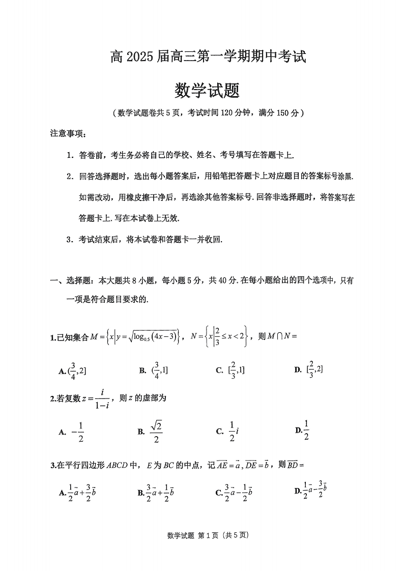 重庆市主城五区高2025届高三第一学期期中考试数学